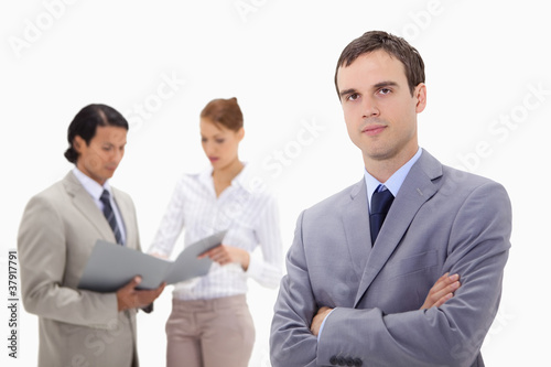 Young businessman with talking colleagues behind him