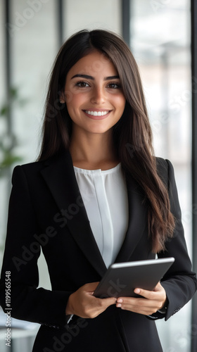 Young businesswoman wearing a stylish suit, holding a tablet and smiling confidently in a modern office environment