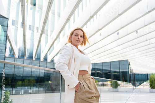 Young businesswoman with short blond hair in blazer and pants leaning on railing while looking at camera outside modern office building during daytime