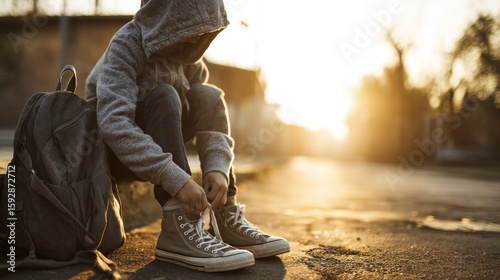 calmness, empty, young, moment, urban, sunlight, street, preparation, sharpened, sneaker, serene, concentration, pavement, quiet, outdoors, peaceful, reflective, boy, leaning, shoe, tying, solitude, beginning, jean, caucasian, sitting, casual attire, lace, morning, shadow, thoughtful, backpack, mood, glow, city, teenage, soft, childhood, orange, relaxed, hoodie, dawn, early