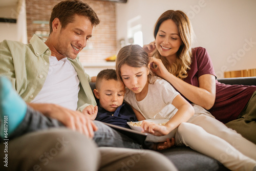 people, young, family, caucasian, tablet, couch, living room, mother, father, sibling, daughter, son, 4, entertainment, popcorn, bonding, affection, technology, daytime, emotion, happiness, activity, togetherness, modern, screen, digital, leisure, parenting, children, home, comfort, cushion, motion picture, relaxation, quality time, snack, multimedia, streaming, sibling, joy, electronic, weekend, love, communication, oneness, girl, boy, lifestyle