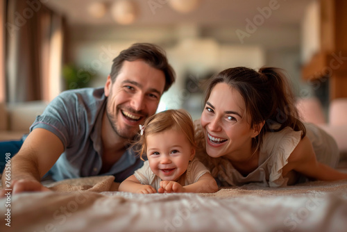 Young Caucasian family with small daughter pose looking to the camera on floor in living room, show love and gratitude