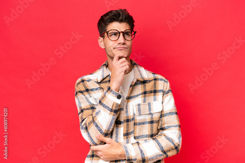 Young caucasian handsome man isolated on red background having doubts and thinking