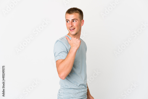 person, man, background, white, young, male, adult, casual attire, guy, photogenic, isolated, standing, studio, attractive, model, portrait, crossed, caucasian, boy, face, cool, hispanic, 1, lifestyle, finger, looking, laughing, cheerful, copy space, away, copy, expression, joyful, mouth, open, pleased, pointing, space, thumb, happy, indicating, advertising, pleasant, teeth