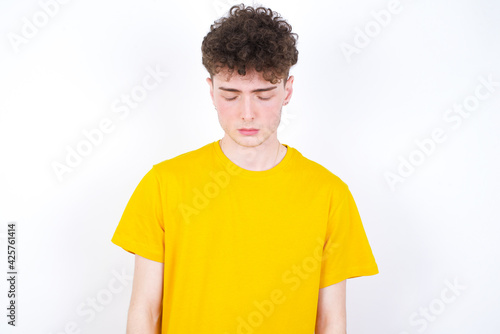 young caucasian handsome man with curly hair wearing yellow T-shirt against white studio background looking sleepy and tired, exhausted for fatigue and hangover, lazy eyes in the morning.