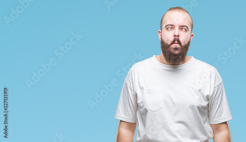 Young caucasian hipster man wearing casual t-shirt over isolated background making fish face with lips, crazy and comical gesture. Funny expression.