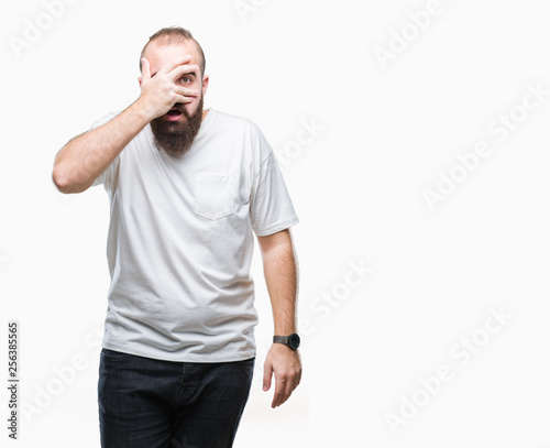 Young caucasian hipster man wearing casual t-shirt over isolated background peeking in shock covering face and eyes with hand, looking through fingers with embarrassed expression.