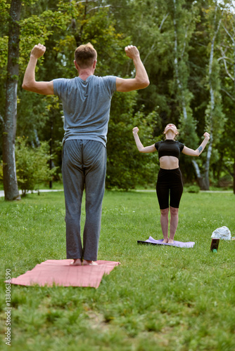 Young caucasian male and female performing qigong in lush park. Sunlit, serene ambiance adds calm. Stretching, grounding on mats, engaging deeply with nature