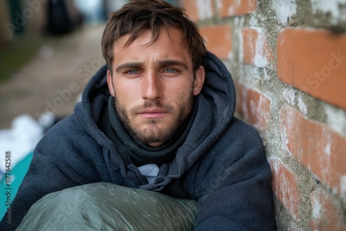 male, caucasian, young, homelessness, outdoors, man, brick, wall, sad, cold, hoodie, beard, eye, sleeping, rough, urban, survival, wants, street, life, despair, gritty, reality, loneliness, distress, city landscape, struggle, face, winter, shelter, tarp, texture, emotion, isolation, looking, reflective, poverty, solitude, jacket, daytime, person, human, searching, harsh