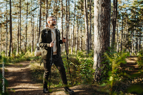 Young caucasian man hiking or trekking through the forest