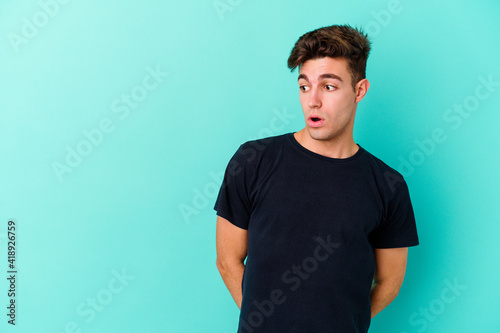 Young caucasian man isolated on blue background being shocked because of something she has seen.