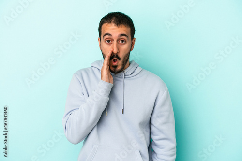 Young caucasian man isolated on blue background is saying a secret hot braking news and looking aside