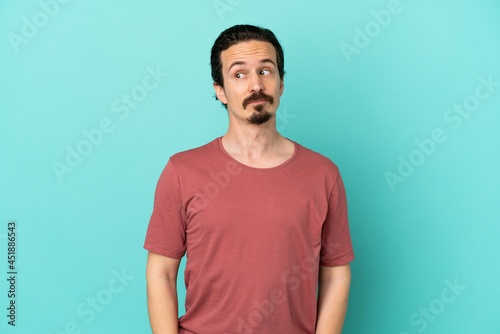 Young caucasian man isolated on blue background making doubts gesture looking side