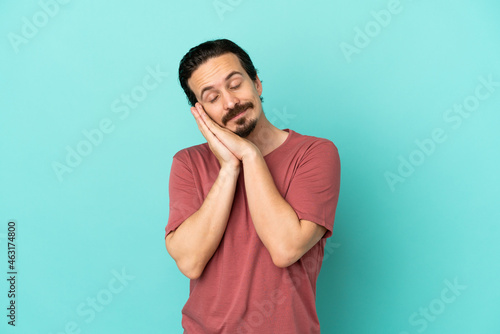 Young caucasian man isolated on blue background making sleep gesture in dorable expression