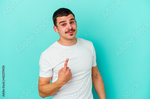Young caucasian man isolated on blue background pointing with finger at you as if inviting come closer.