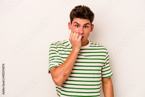 Young caucasian man isolated on white background biting fingernails, nervous and very anxious.