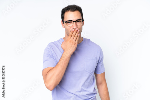 Young caucasian man isolated on white background happy and smiling covering mouth with hand