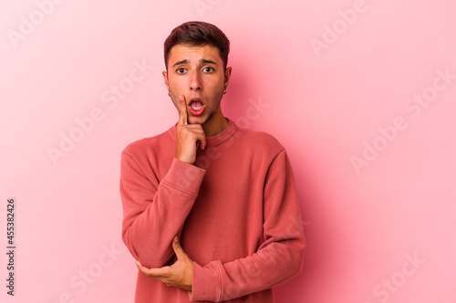 Young caucasian man with tattoos isolated on yellow background having some great idea, concept of creativity.