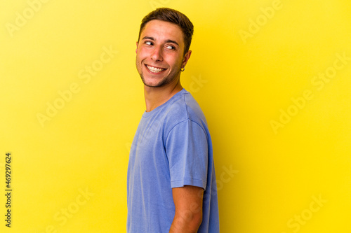 Young caucasian man with tattoos isolated on yellow background looks aside smiling, cheerful and pleasant.