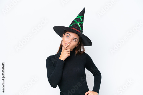 Young caucasian woman costume as witch isolated on white background having doubts and with confuse face expression