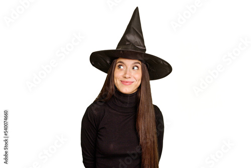 Young caucasian woman dressed as a witch for halloween day isolated dreaming of achieving goals and purposes