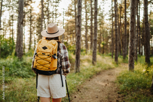 Young caucasian woman hiking or trekking through scenic forest with hiking poles