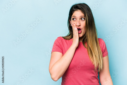 Young caucasian woman isolated on blue background is saying a secret hot braking news and looking aside