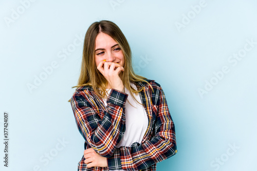 Young caucasian woman isolated on blue background laughing happy, carefree, natural emotion.