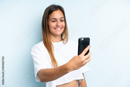 Young caucasian woman isolated on blue background making a selfie with mobile phone
