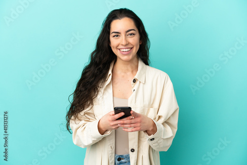 Young caucasian woman isolated on blue background sending a message with the mobile