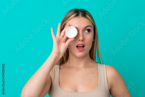 girl, woman, people, person, female, woman, lady, attractive, beauty, pretty, beautiful, cute, youth, young, adult, blond, 1, portrait, coiffure, background, isolated, wall, colours, colourful, blue, face, cream, skin, moisturiser, skincare, applying, care, lotion, treatment, healthy, apply, facial, cosmetic, dermatology