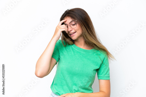 girl, woman, people, person, female, woman, lady, attractive, beauty, pretty, beautiful, youth, young, adult, blond, caucasian, 1, portrait, background, isolated, wall, white, blank, happy, laugh, funny, laughing, smile, happiness, expression, gesture, good, positive, proud