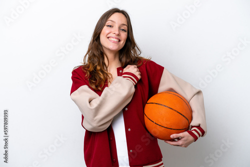 Young caucasian woman playing basketball isolated on white background celebrating a victory