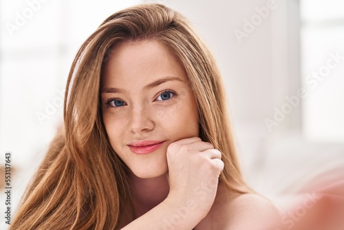 Young caucasian woman smiling confident sitting on bed at bedroom