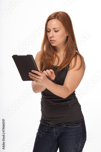 young, adult, caucasian, woman, female, studio, long hair, red hair, redhead, pretty, beautiful, sexy, white background, casual attire, tablet, computer, swipe, cyberspace, app