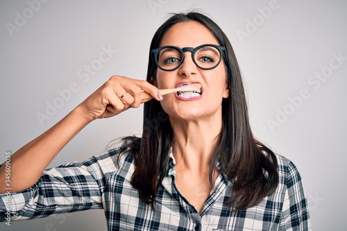 Young caucasian woman wearing glasses brushing her teeth using tooth brush and oral paste, cleaning teeth and tongue as healthy health care morning routine