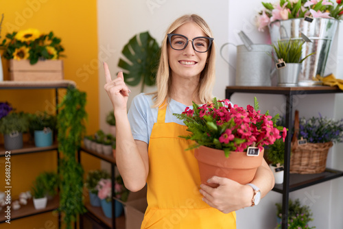 Young caucasian woman working at florist shop holding plant smiling happy pointing with hand and finger to the side