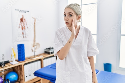 Young caucasian woman working at pain recovery clinic hand on mouth telling secret rumor, whispering malicious talk conversation