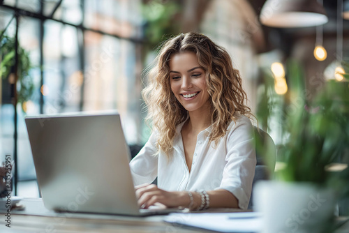 Young cheerful businesswoman working on a laptop in a stylish urban office, exemplifying professional success and modern work culture