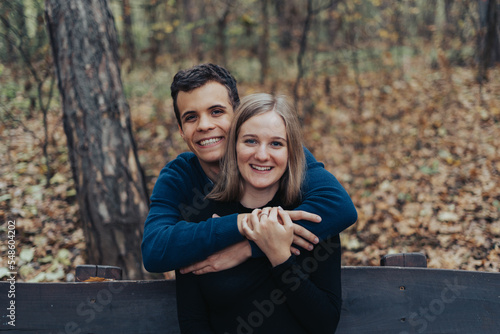 forest, affection, autumn, bench, boyfriend, casual clothes, caucasian, cheerful, couple, date, dating, girlfriend, happiness, kiss, love, nature, outdoors, park, people, human relationships, romance, romantic, smile, summer, together, tree, 2, young