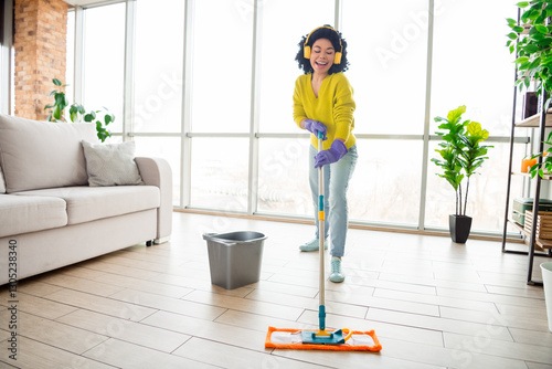 Young, cheerful woman mopping the floor in her cozy living room, embracing a domestic and stylish lifestyle