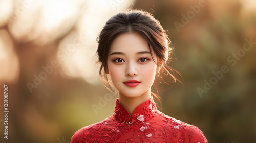young Chinese woman in red traditional dress, smiling softly in natural setting, exuding elegance and grace