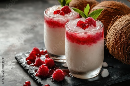 Young coconut ice is a drink of cold coconut water fresh young coconut and red syrup