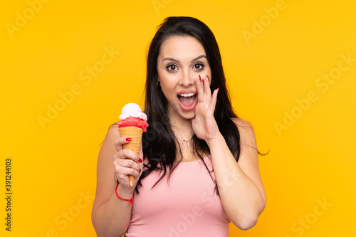 Young Colombian girl holding an cornet ice cream over isolated yellow background shouting with mouth wide open