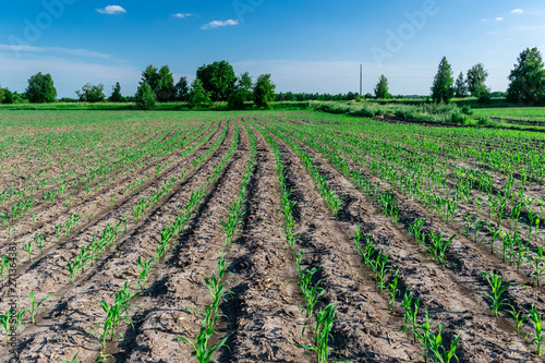 agricultural, agriculture, background, corn, cornfield, country, countryside, crop, cultivated, farm, farming, farmland, field, food, fresh, green, grow, growing, growth, harvest, healthy, industry, land, landscape, leaf, maize, natural, nature, organic, plant, plantation, plant, row, rural, scene, season, dirtied, spring, summer, sunlight, vegetable, young