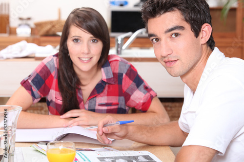 university, student, paperwork, mag, crossword, newspaper, puzzle, homework, work, pen, leisure, activity, young, couple, boyfriend, girlfriend, man, woman, girl, people, kitchen, home, table, indoor, inside, interior, landscape, caucasian, european, fresh, attractive, good-looking, sibling, family