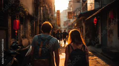 Young Couple Exploring a Hidden Alleyway in a Vibrant City at Sunset