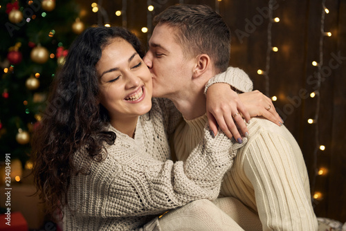 couple, girl, man, love, christmas, kiss, light, decoration, white, romantic, young, fir, tree, dark, wooden, background, winter, holiday, concept, people, happy, celebration, wool, sweater, long hair, to sit, hugs, together, smile, indoor, interior, bright, black, brown, woman, evening, garland, yellow, gift, new, year, family, beautiful, christmas, caucasian, fun, latin, hispanic, bulgarian