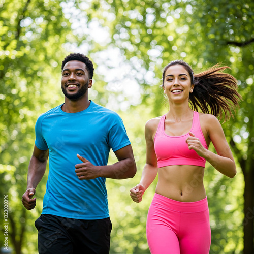 young couple jogging in park. Portrait of happy fit people running together outdoors. Couple sport healthy lifestyle concept.