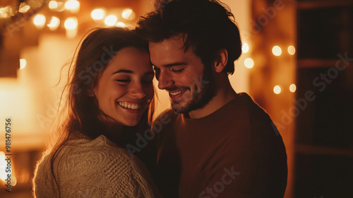 Young couple smiling while standing in front of a cozy fireplace, warm ambiance and soft lighting
